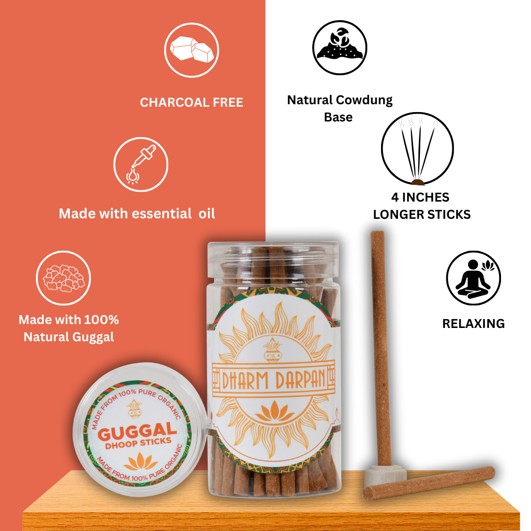 Experience the purity of tradition with Dharm Darpan Guggal Dhoop Sticks, made with cow dung, guggal, flowers, herbs, and natural essential oils. Free from bamboo and charcoal, these all-natural sticks burn cleanly without black smoke, slowly releasing their natural fragrance for about 45 minutes.